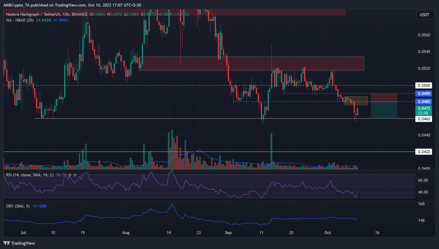 The recovery seen at the time of writing from Q3 support hit a new hurdle and a daily bearish OB of $0.0476 – $0.0486 (orange). A price rejection on this hurdle could drag the HBAR lower to retest support for the third quarter. If so, such a move could yield modest shorting profits.