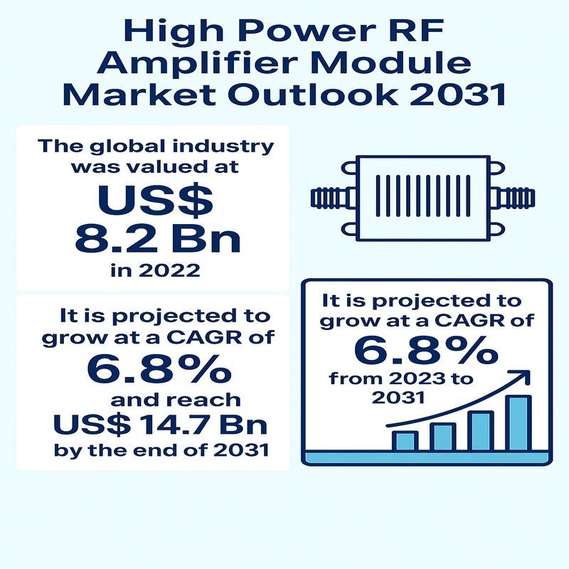 The market for High Power RF (radio frequency) amplifier module is ready for considerable growth in the coming years. With a market size worth US $ 8.2 billion in 2022, this sector is expected to expand with a compound annual growth rate (CAGR) of 6.8%, with an estimated value of US $ 14.7 billion in 2031. The steady progression of the world market, wireless, and the following apples, and the subsequent apples and the following stamps and the following stamps and the stacks of the stacks can be stated and the following stamps and the following stamps of the stainstems and Acceptance of the defense sector.