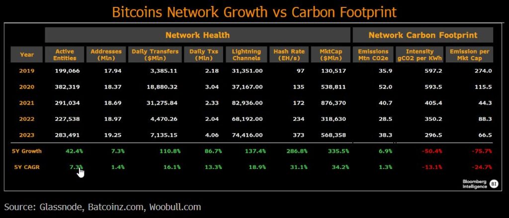 As shown in the statistics below, while the network has grown in virtually all key performance indicators (KPIs) of on-chain activities, its carbon footprints have continued to decline, much to the delight of Bitcoin proponents.