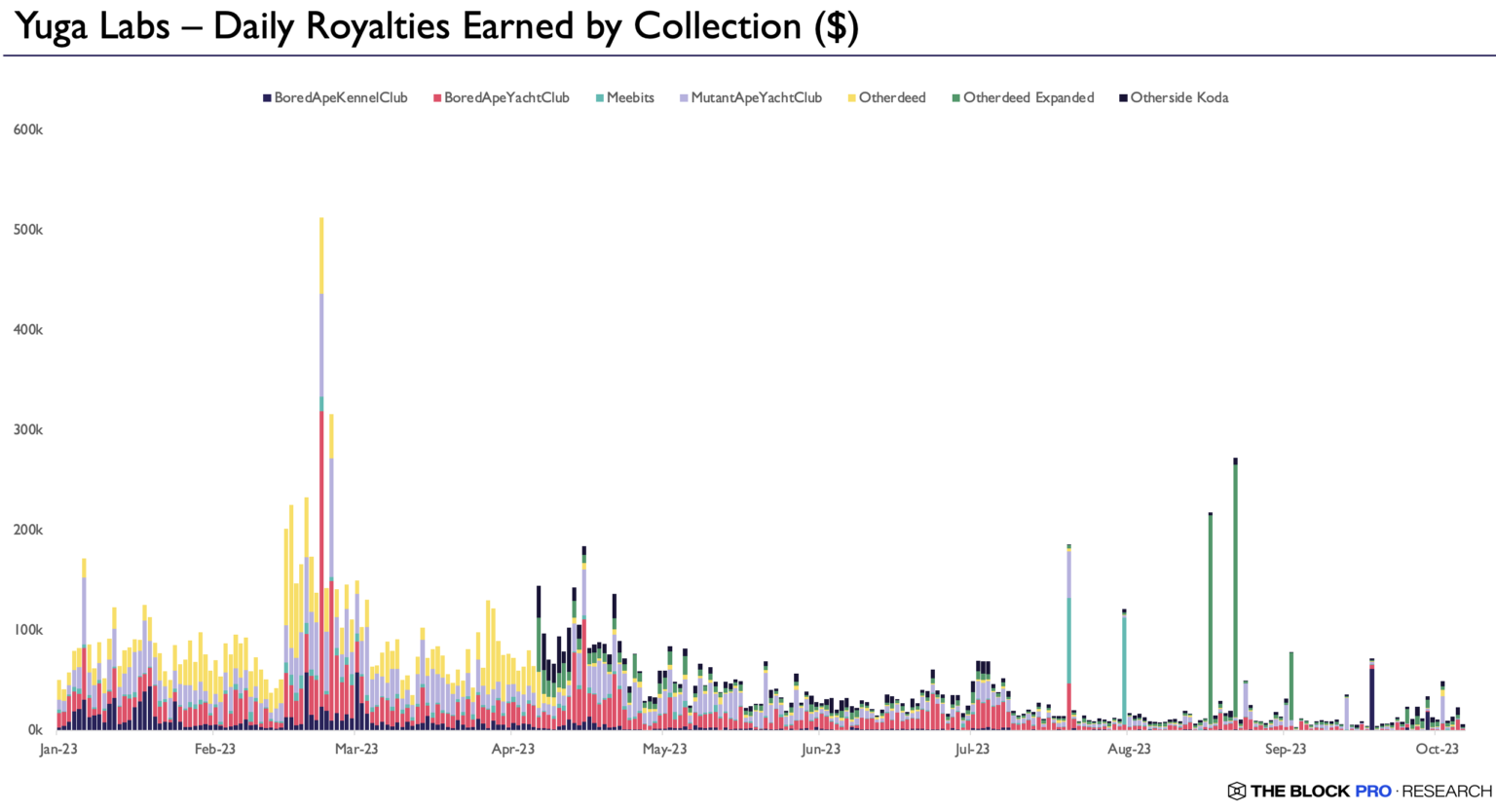 A look at the amount of royalties paid to Yuga Labs every day since January 2023. Image: The Block Research.