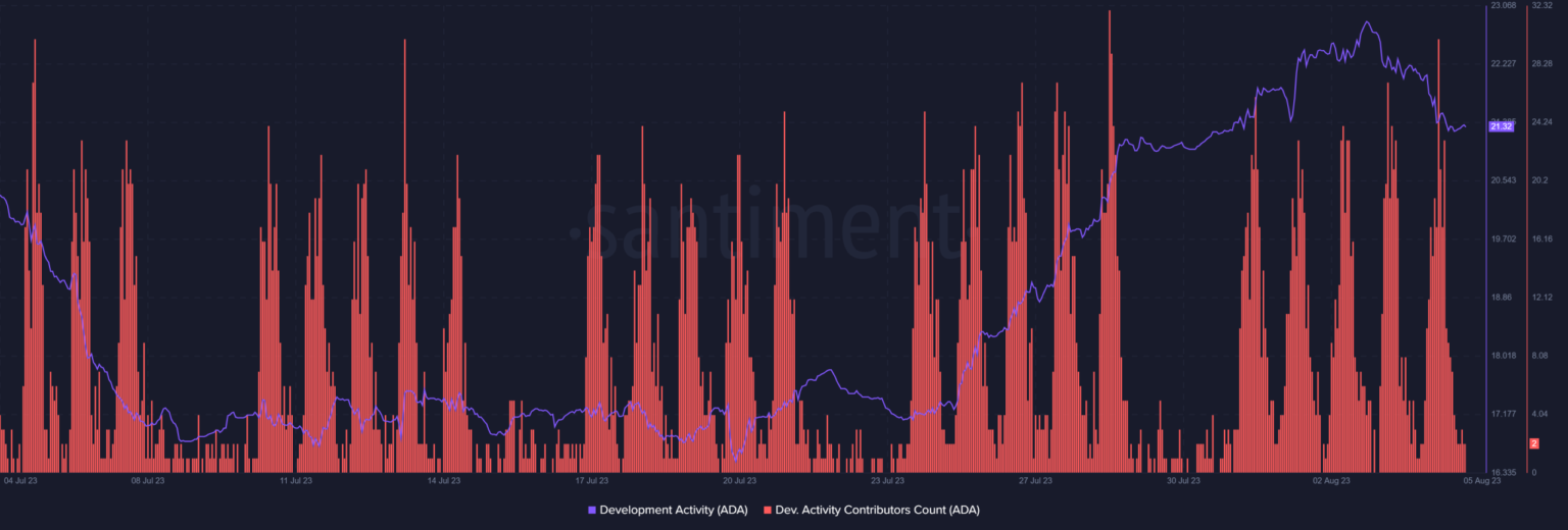 While development activity remained high, the native token’s price action turned bearish. From CoinMarketCap, the price of ADA fell more than 6% in the past week. At the time of writing, it was trading at $0.2915 with a market cap of over $10 billion.