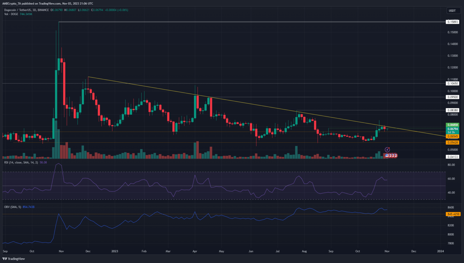 On the three-day chart, the market structure was bullish after the move above the recent lower high at $0.06858. The RSI also crept above the neutral 50, indicating the bulls have an edge. On-Balance Volume has also been on a slow upward trend since July.