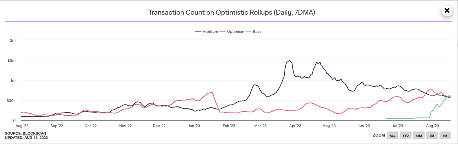 On-chain analysis of daily transaction counts across the three networks over a 7-day rolling average showed that Base’s average daily transactions totaled 557,140 on Aug. 15. Optimism trailed with 597,000, while Arbitrum was third with 576,000.