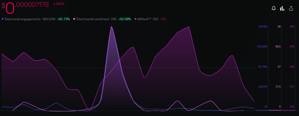 LunarCrush’s data showed that SHIB‘s social engagement has increased over the past 24 hours. However, most mentions have been negative as bearish sentiment around the meme coin has risen significantly over the past 24 hours.