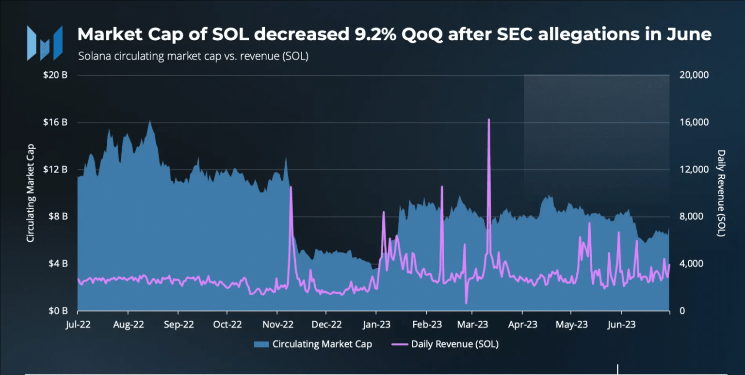 Following the SEC complaint and associated delisting, exchanges including Robinhood revealed their intentions to remove SOL from their platforms. This series of events was accompanied by a downward impact on the value of SOL. Prices fell 9.2% compared to the broader market’s modest 1.3% quarter-on-quarter (QoQ) increase.