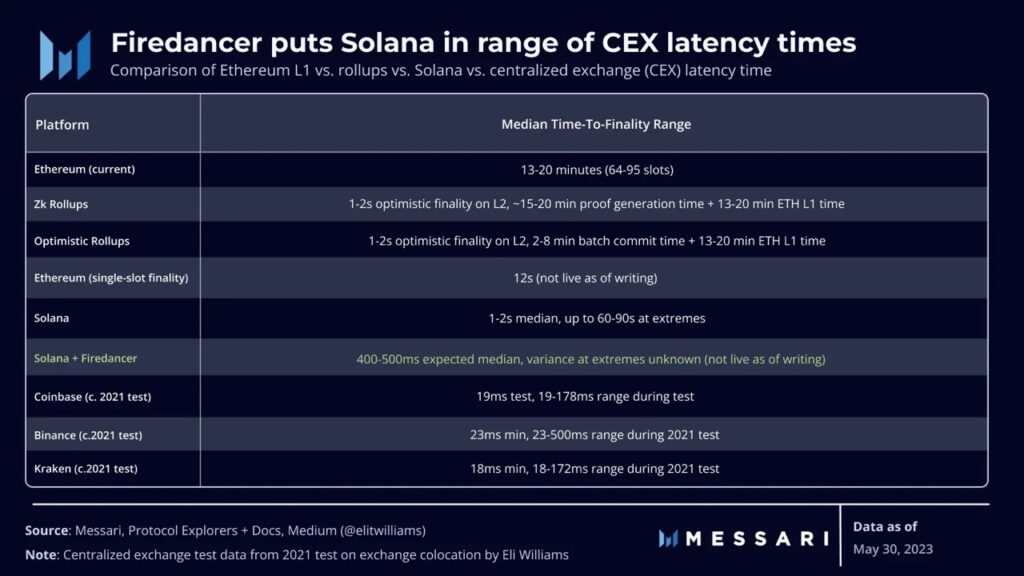 The data suggests that Firedancer can improve DeFi maturity by reducing latency times, bringing decentralized exchanges closer to parity with centralized exchanges.