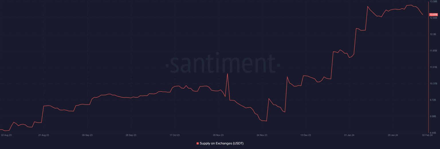 Furthermore, an analysis of USDT’s supply on exchanges showed a consistent increase since November 2023. As of the end of November 2023, the total supply on exchanges was approximately $9.4 billion.