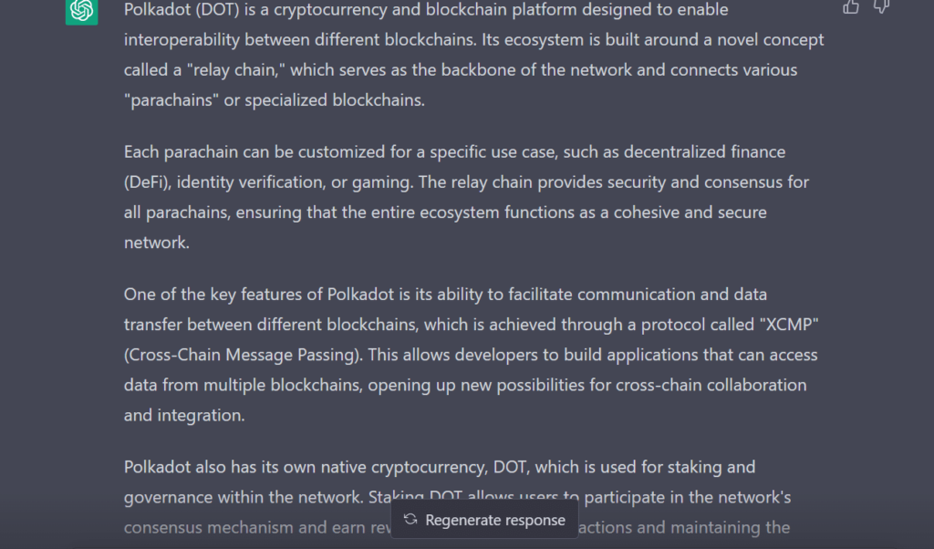 We started with the basics and asked ChatGPT to explain what Polkadot is and how the ecosystem works –
