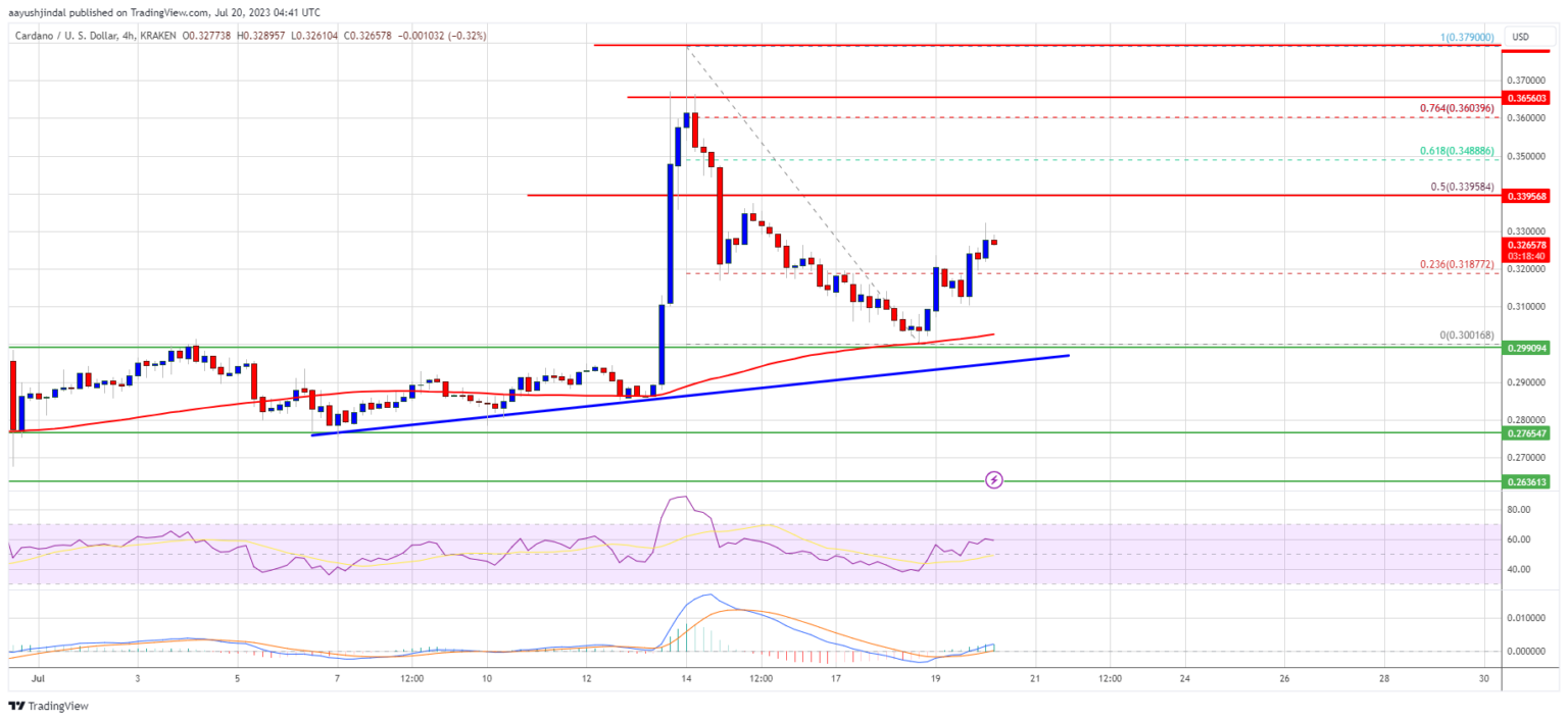 Cardano price holds key support at $0.30. ADA could start a steady rise if there is a clear move above the $0.340 resistance.