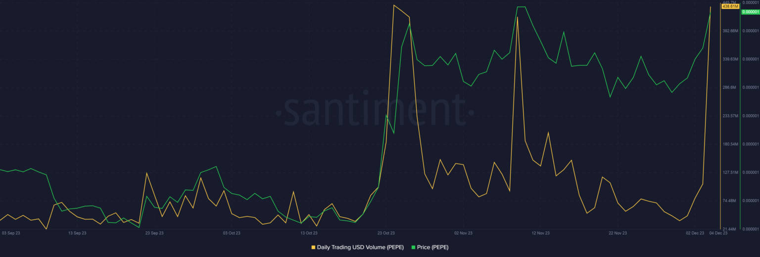 Daily trading volume quadrupled from the previous day to more than $438 million, according to data retrieved by AMBCrypto from Santiment.