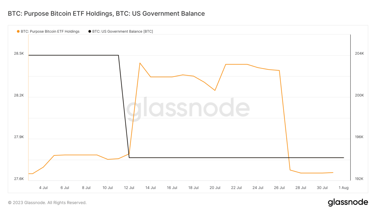 Similarly, we saw a significant amount of Bitcoin outflows from the U.S. government’s holdings in July. Also worth noting is that the outflows from the U.S. government and the Purpose Bitcoin ETF holdings have leveled out. In other words, Bitcoin’s sell pressure was cooling off.