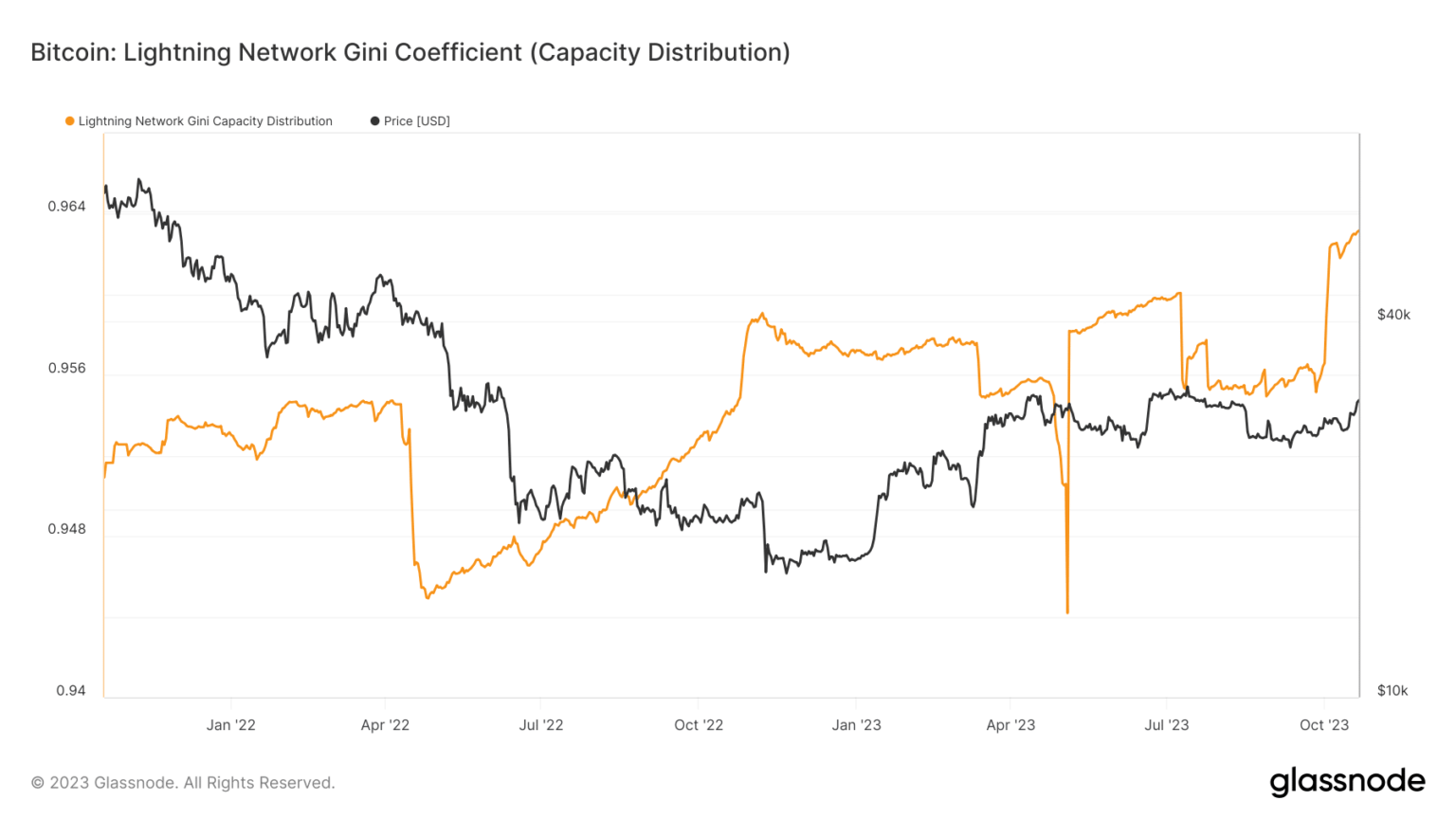 With a value ranging from 0-1, the Gini coefficient provides insight TThe degree of centralization and potential risks associated with a highly concentrated distribution of Bitcoin capacity.