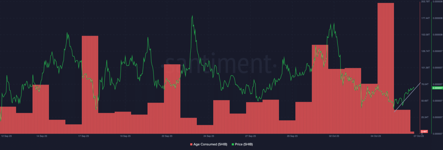According to Santiment data, SHIB’s Age Consumed increased to 200.78 trillion on October 5, which is the highest daily value in the past month. The price of the altcoin closed the trading day at $0.0000071 and has risen slightly since then.