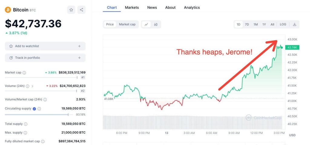 Between ~7am and ~3:30pm ET on Wednesday, Bitcoin jumped from around $40.9k to $42.7k, adding a cool $36 billion to its market cap.