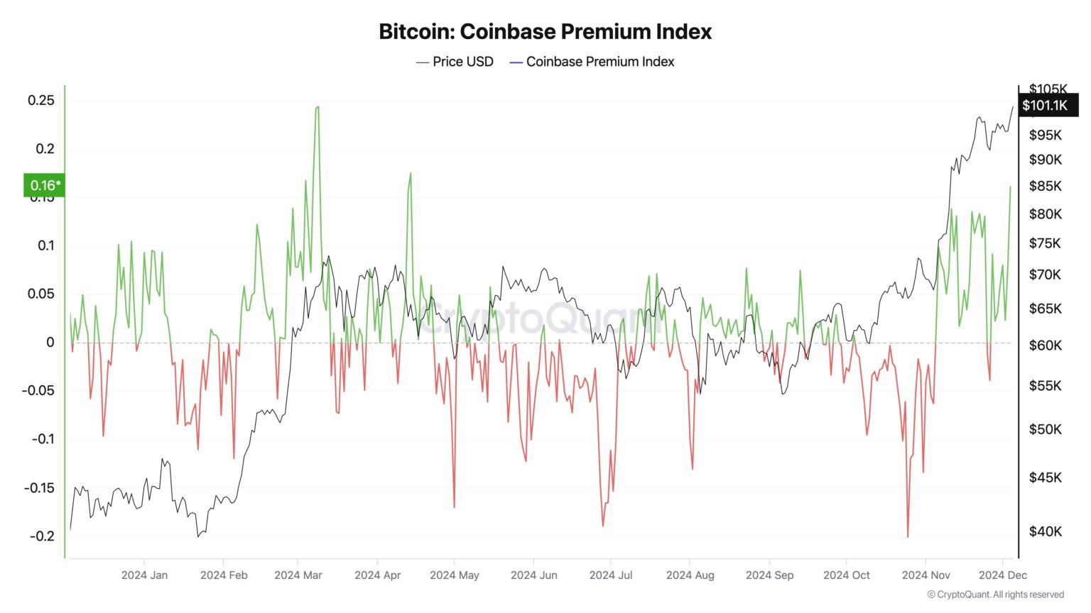 In support of this idea, CryptoQuant reported: “Bitcoin passes $100,000 as institutional demand drives the market. The Coinbase Premium Index highlights the continued buying pressure from U.S. investors.”
