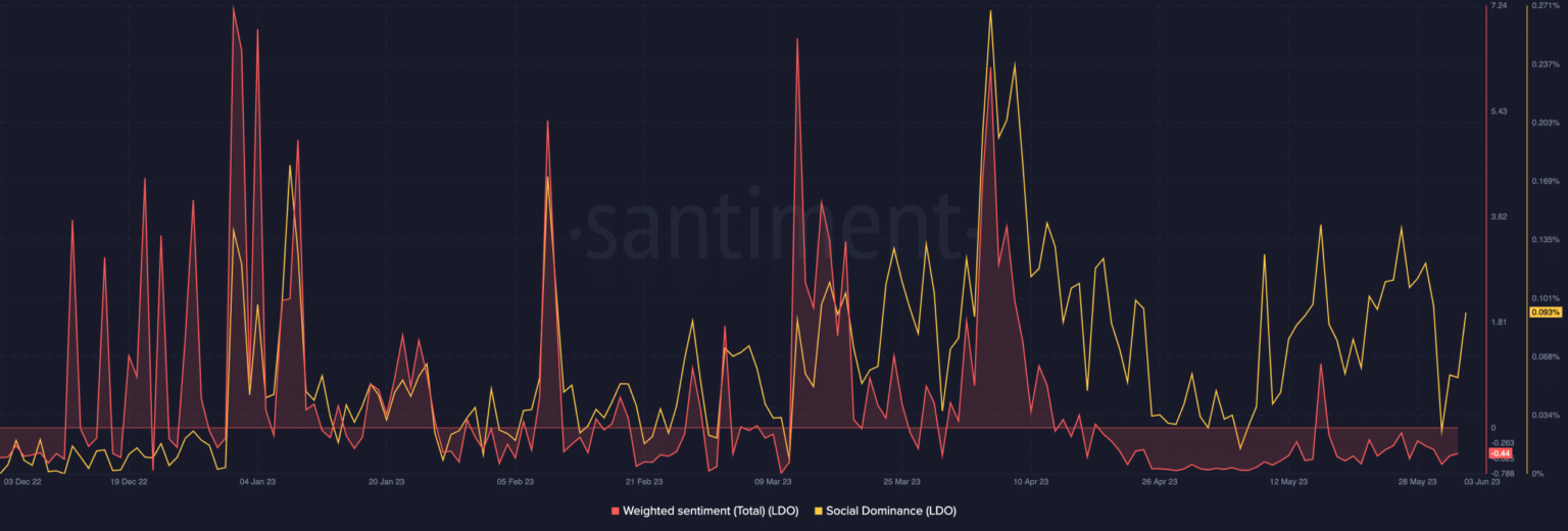 However, Lido’s social dominance spiked sharply since May 31 and has maintained the increase as of this writing. The social dominance shows the share of discussion surrounding an asset compared to other cryptocurrencies in the top 100 by market cap.