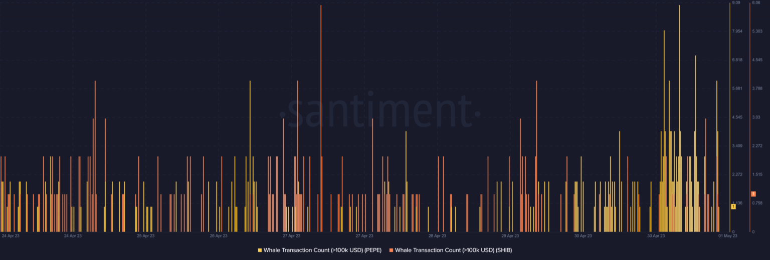 In addition, whale interest in PEPE increased compared to SHIB, as evidenced by the token’s spike in whale transactions.