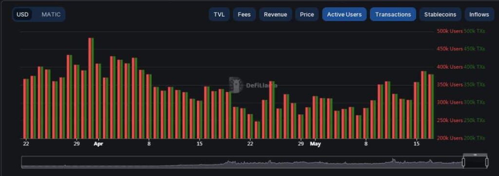 After a long period of rest, network activity on Polygon [MATIC] began to gain strength. According to DeFiLlama, the active users on Ethereum [ETH] sidechain surged to 389,000 on May 16, reaching its highest level in five weeks.