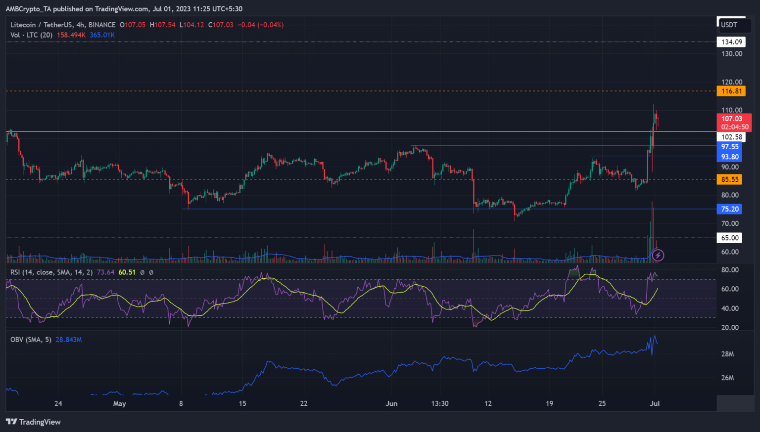 The move and close above the previous high of $103 has caused LTC to reach a new high of $112 in 2023. At the time of writing, the near-term rally had cooled to its previous high before moving to $107. Nevertheless, the cross to $100 turned the lower and higher time frame into a bullish bias.