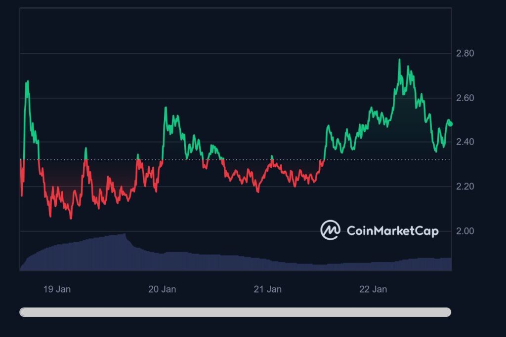 The token gained more than 6% to $2.52 in the past 24 trading hours, with daily trading volume surging by as much as 70%.