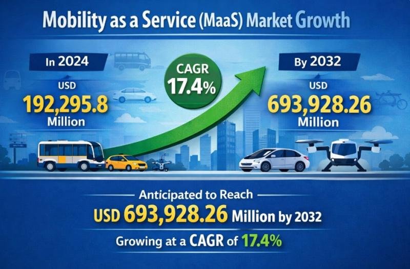 De Mobility as a Service (MaaS)-markt ondergaat een transformatieve expansie, waardoor de manier waarop individuen en bedrijven wereldwijd toegang krijgen tot transportdiensten en deze gebruiken, opnieuw wordt gedefinieerd. De markt, die in 2024 wordt gewaardeerd op 192.295,8 miljoen dollar, zal naar verwachting in 2032 693.928,26 miljoen dollar bereiken, wat tijdens de prognoseperiode een opmerkelijke CAGR van 17,4% zal bereiken. Deze snelle groei weerspiegelt de mondiale verschuiving naar geïntegreerde, ‘digital-first’ en duurzame mobiliteitsecosystemen.