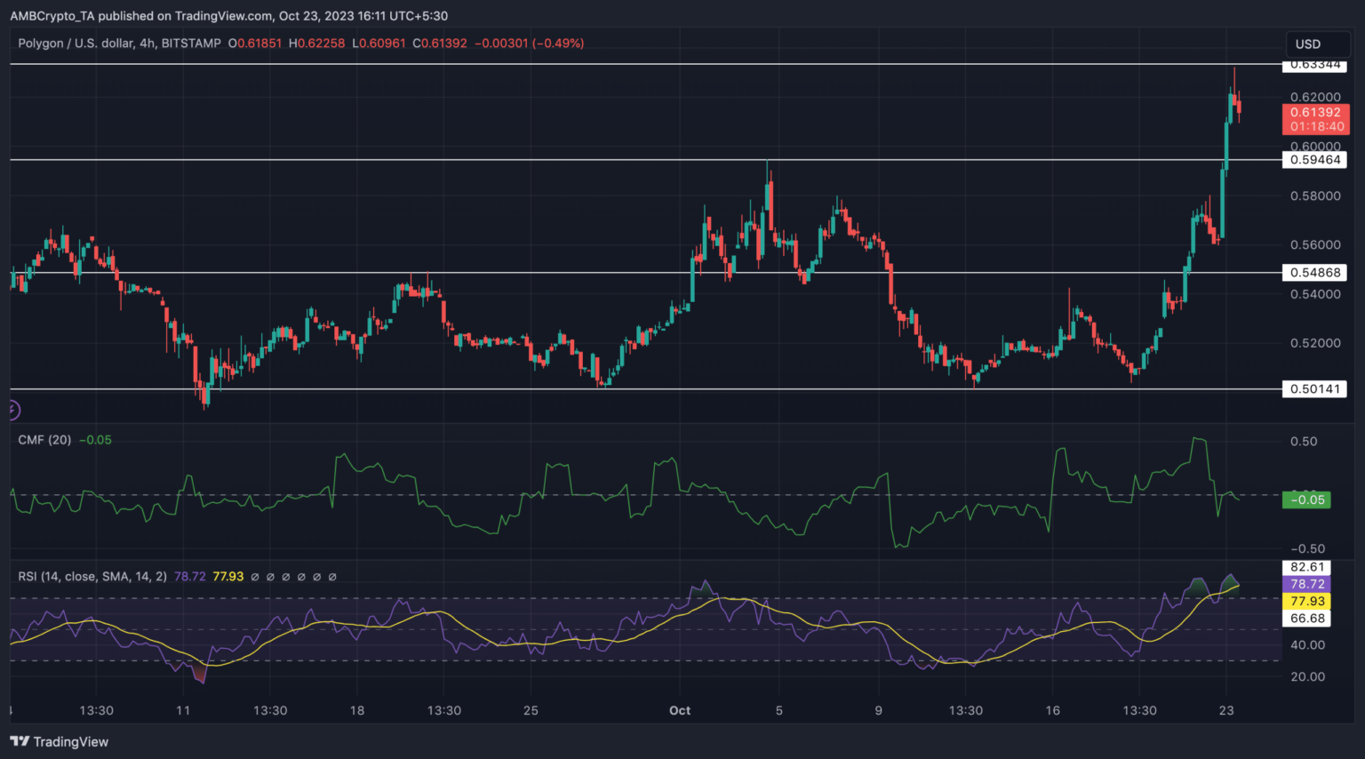 On October 12, MATIC faced a key test as it approached the $0.501 support level. The token not only overcame this hurdle but also rose by an impressive 25%. At the time of writing, MATIC was trading at $0.634, reflecting its substantial growth in a short period of time.