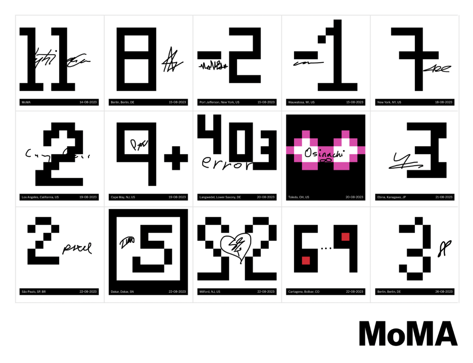 To kick off the program, MoMA invited 15 digital artists to collaborate on a series, entitled “First 15,” of the first postcards chained as part of the project. Each of these 15 cards, which were digitally passed on to all artists, was tailored to a unique assignment; participating artists included Dmitri Chernyak, Casey Reas, Grant Yun, Anna LuciaAnd Kim Asendorfamong other things.