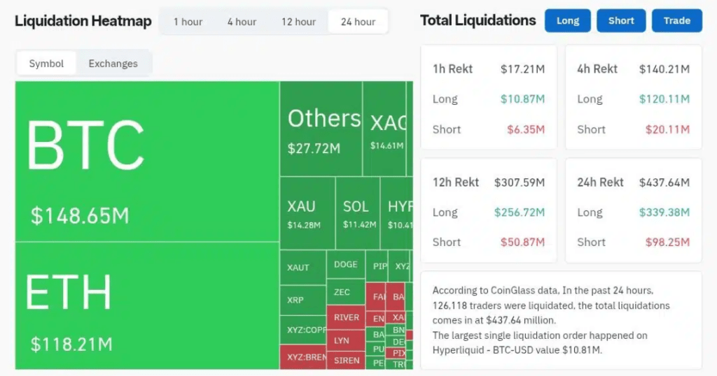 The time division tells the story clearly. The one-hour time frame showed relatively balanced liquidations of $18 million. But zoom out to four hours and the figure jumps to $126 million – and in twelve hours it reached $300 million, almost entirely from leveraged buyers who got caught on the wrong side.