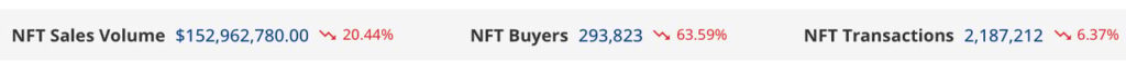After several weeks of consecutive gains, sales of non-fungible tokens (NFTs) are down 20.44% this week compared to the previous week. According to seven-day stats, NFT revenue was $152.96 million last week, with $84 million in sales coming from the Ethereum blockchain.