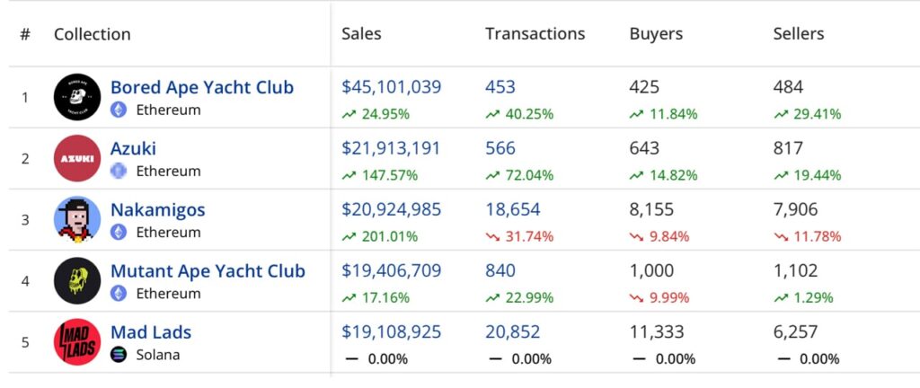 During the month of April, Polygon witnessed a sales increase of 22.75%. Meanwhile, Arbitrum, the sixth largest blockchain in terms of NFT sales, saw its sales increase by 78.35%, amounting to $10.29 million. In terms of NFT collections, Bored Ape Yacht Club (BAYC) emerged as the leader with revenues of $45.10 million.