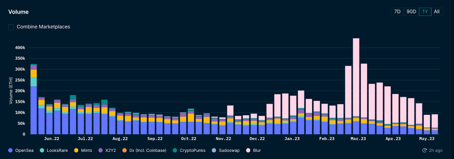 While sales volume increased significantly in the first quarter of 2023 compared to the fourth quarter of 2022, Nansen data shows that there was a pause in April. While $1.7 billion was traded in March, the following 30 days saw a drop in volume with around $1.2 billion generated. The trend is also observed in May as shown below.