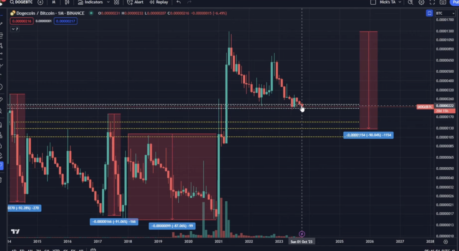 Merten expects a correction of around 90%, which would mean that DOGE/BTC would find its market bottom around 0.00000130.