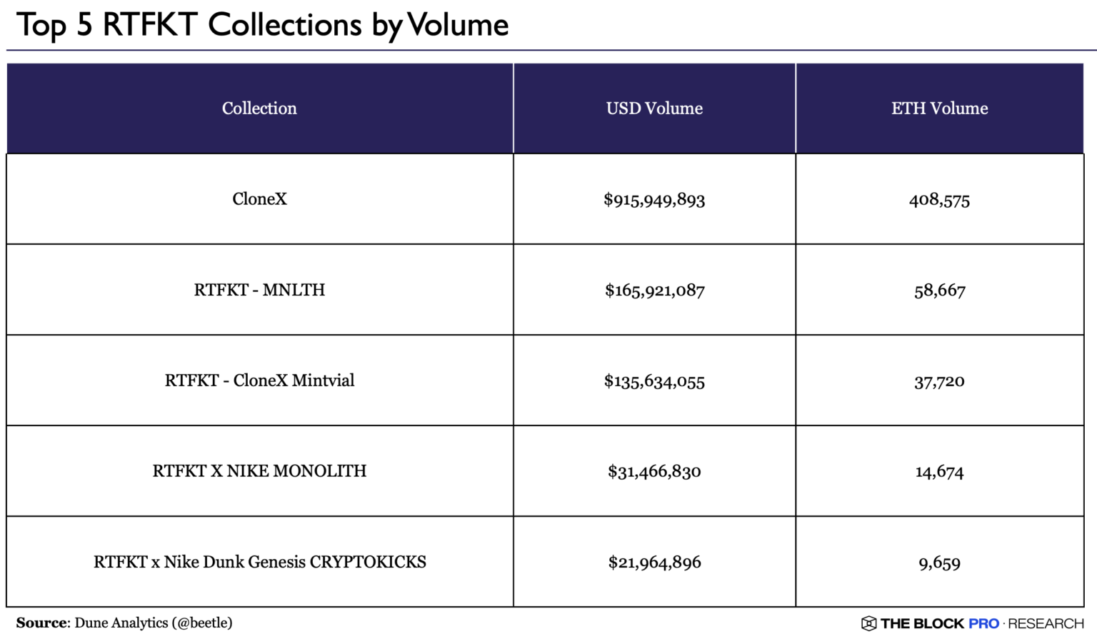According to data from The Block Research, Nike-RTFKT NFTs have generated nearly $1.4 billion in trading volume since December 2021. At the same time, RTFKT’s 20-plus collections, including the late 2021 CloneX-Takashi Murakami avatar NFT drop, have earned $170 million, according to DefiLlama.
