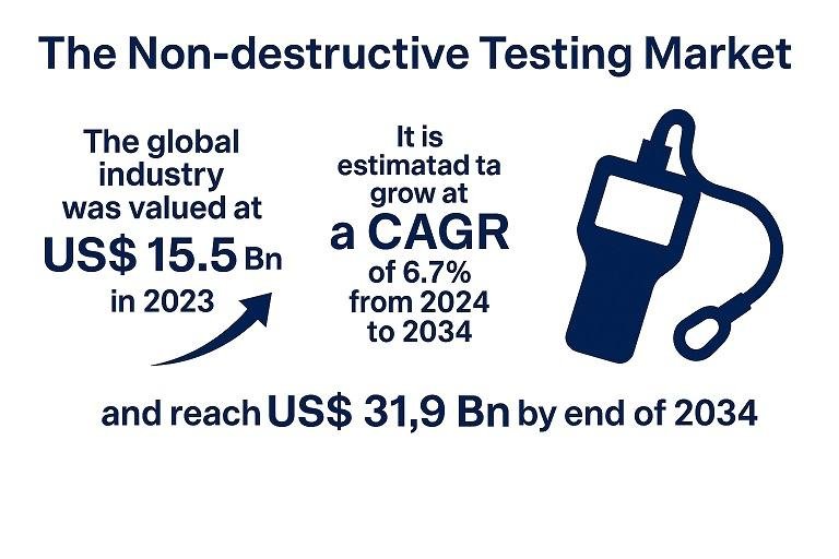 The global non-destructive test (NDT) market is expected to grow with a CAGR of 6.7% from 2024 to 2034, achieving a market value of more than USD 31.9 billion at the end of the prediction period. This growth is driven by increasing investments in advanced test technologies and an increased emphasis on safety, quality assurance and compliance with regulations in important sectors, including space travel, oil and gas, automotive and production.