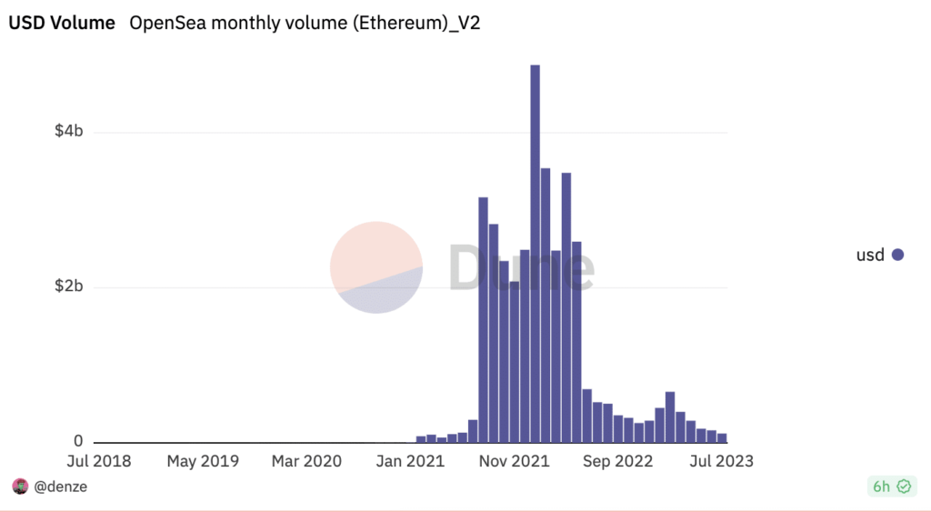 The monthly sales volume of Ethereum and Polygon-based non-fungible tokens (NFTs) on the leading marketplace OpenSea has plummeted to its lowest point this year as July draws to a close, data from Dune Analytics revealed.