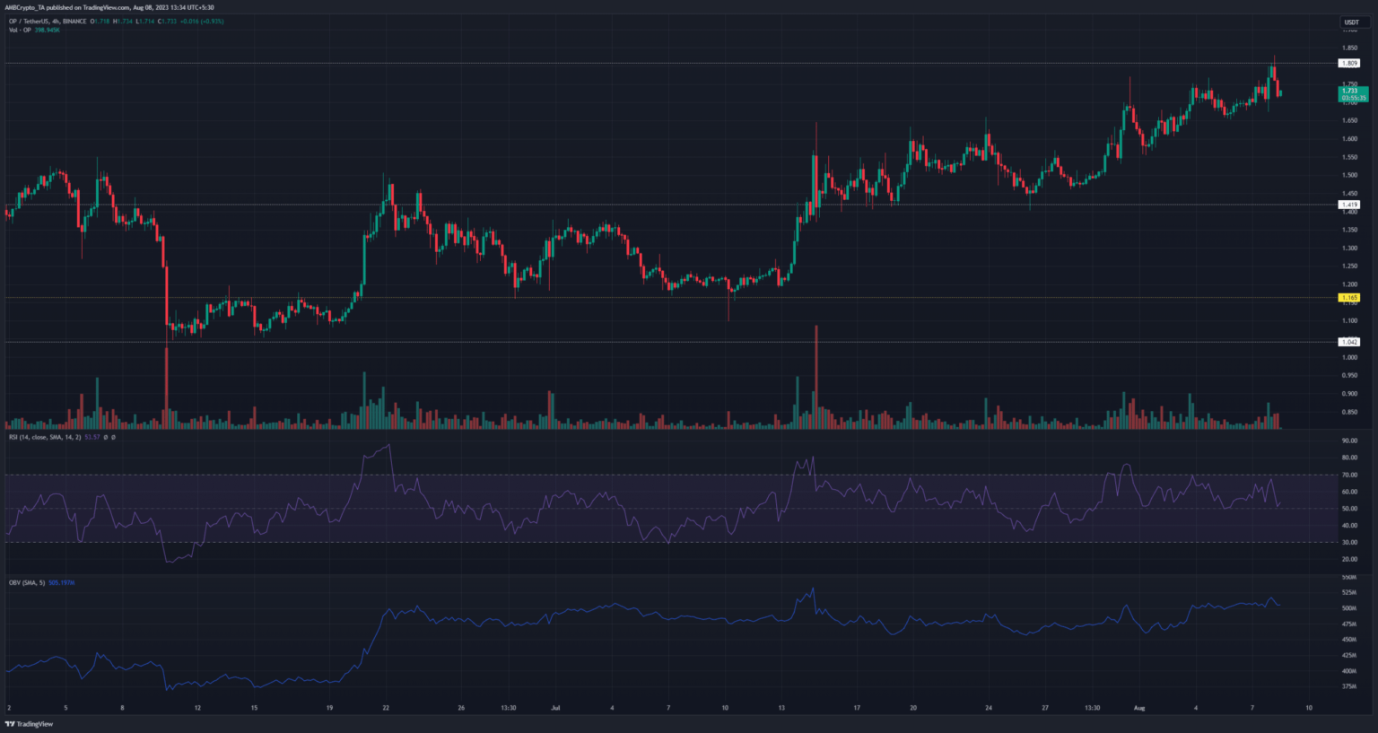 A look at Optimism’s uptrend over the four-hour time frame showed that the altcoin made a series of higher lows as prices rose. July brought further gains as buyers cleared the $1.4 resistance level.