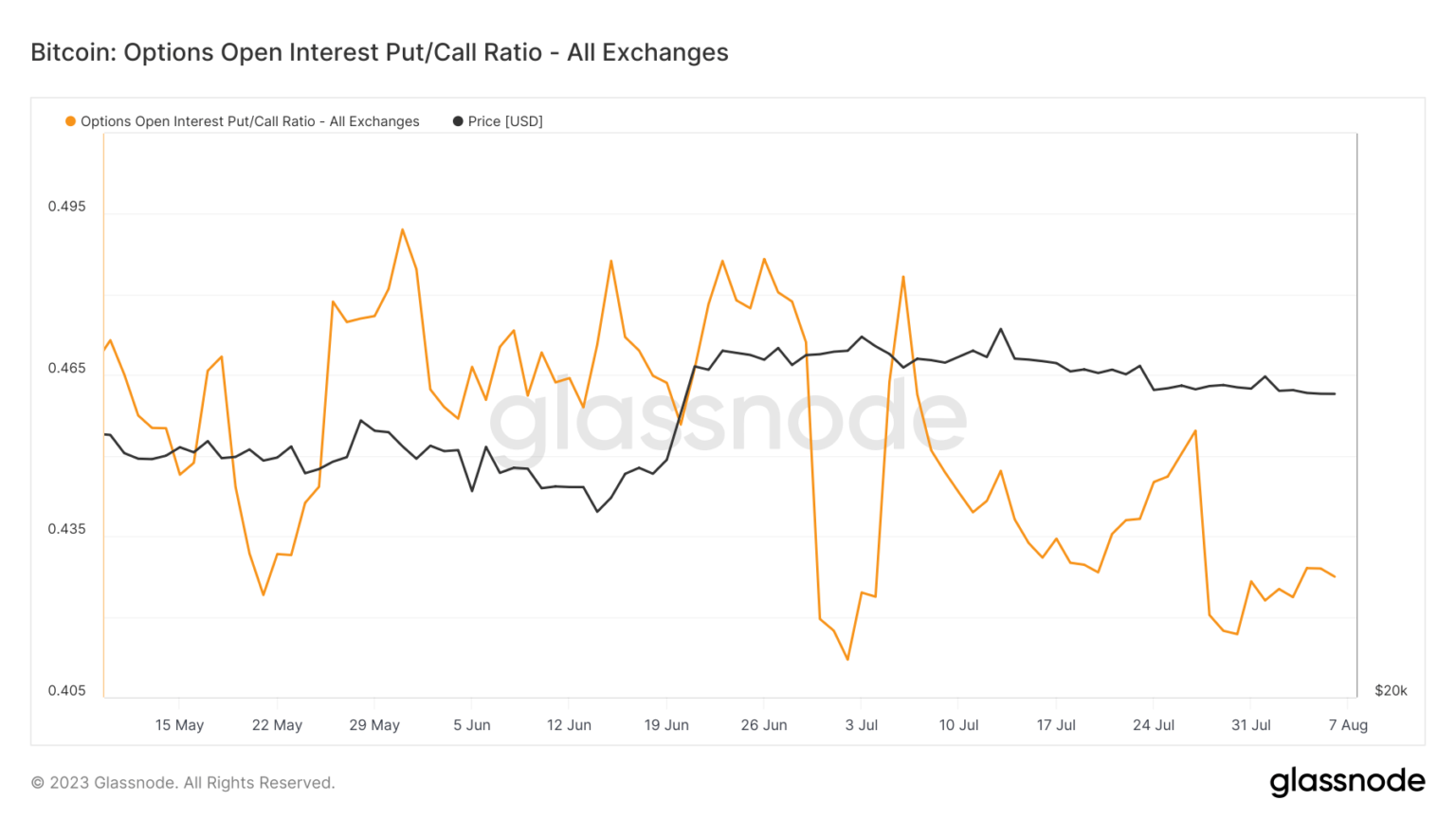 The Bitcoin Options Open Interest Put/Call Ratio is a metric that measures the total number of open put and call options in the market. This ratio dropped sharply on July 27, reaching this year’s lows.
