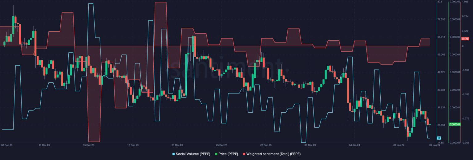 - The price of PEPE continued to decline as social sentiment and volume decreased.