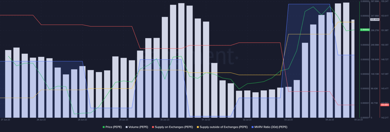 A look at the supply distribution of the memecoin also painted an optimistic picture. The supply of tokens on exchanges decreased, while the supply outside the exchanges increased. This was a typical suggestion of continued higher accumulation. PEPEThe market value to realized value (MVRV) ratio was also significantly higher.
