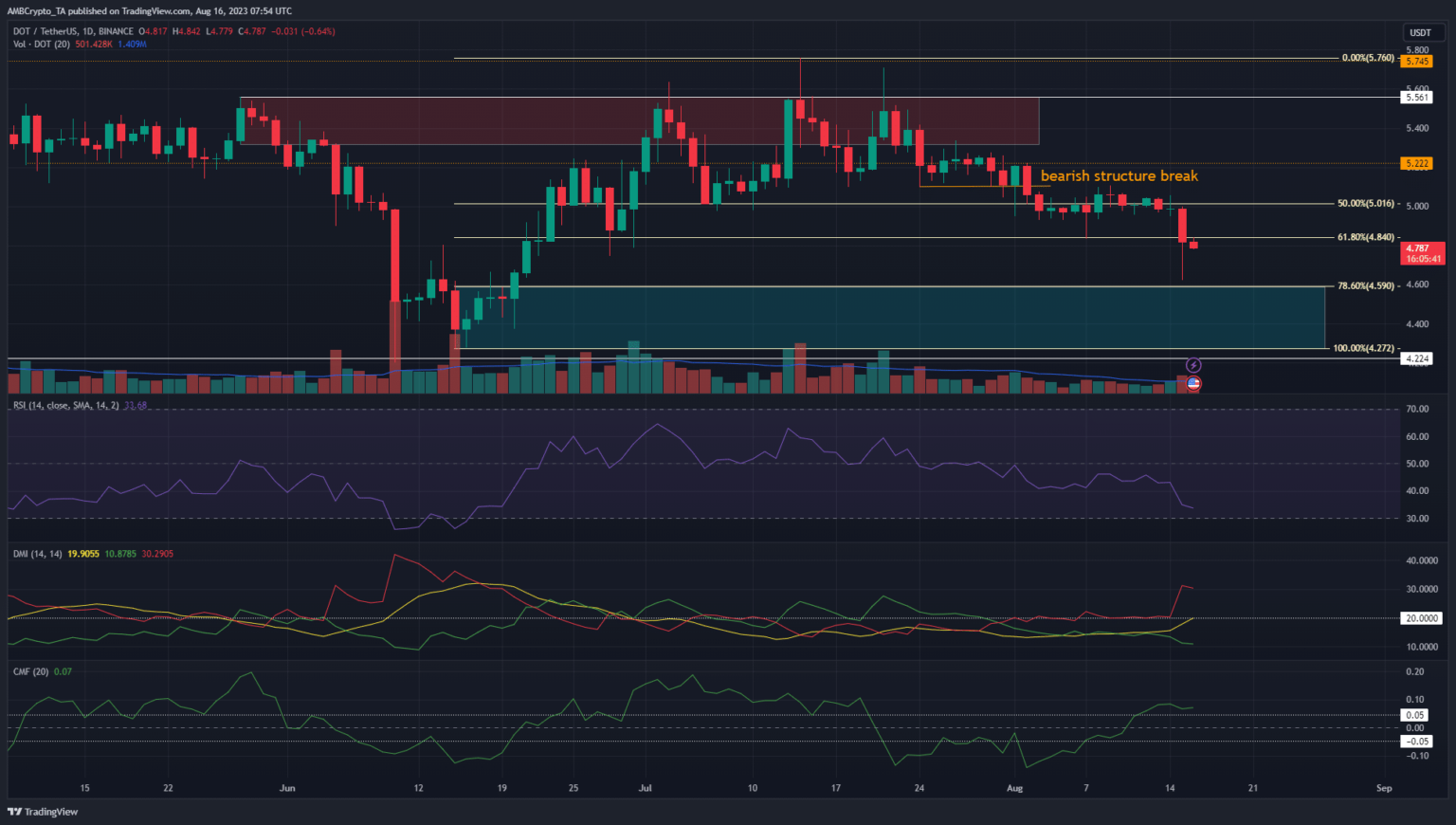 On August 2, DOT dropped below a recent higher low of $5.1. Highlighted in orange, it indicated a break in the market structure in favor of the bears. After that, the price bounced between the $4.95 and $5.06 levels until August 15.