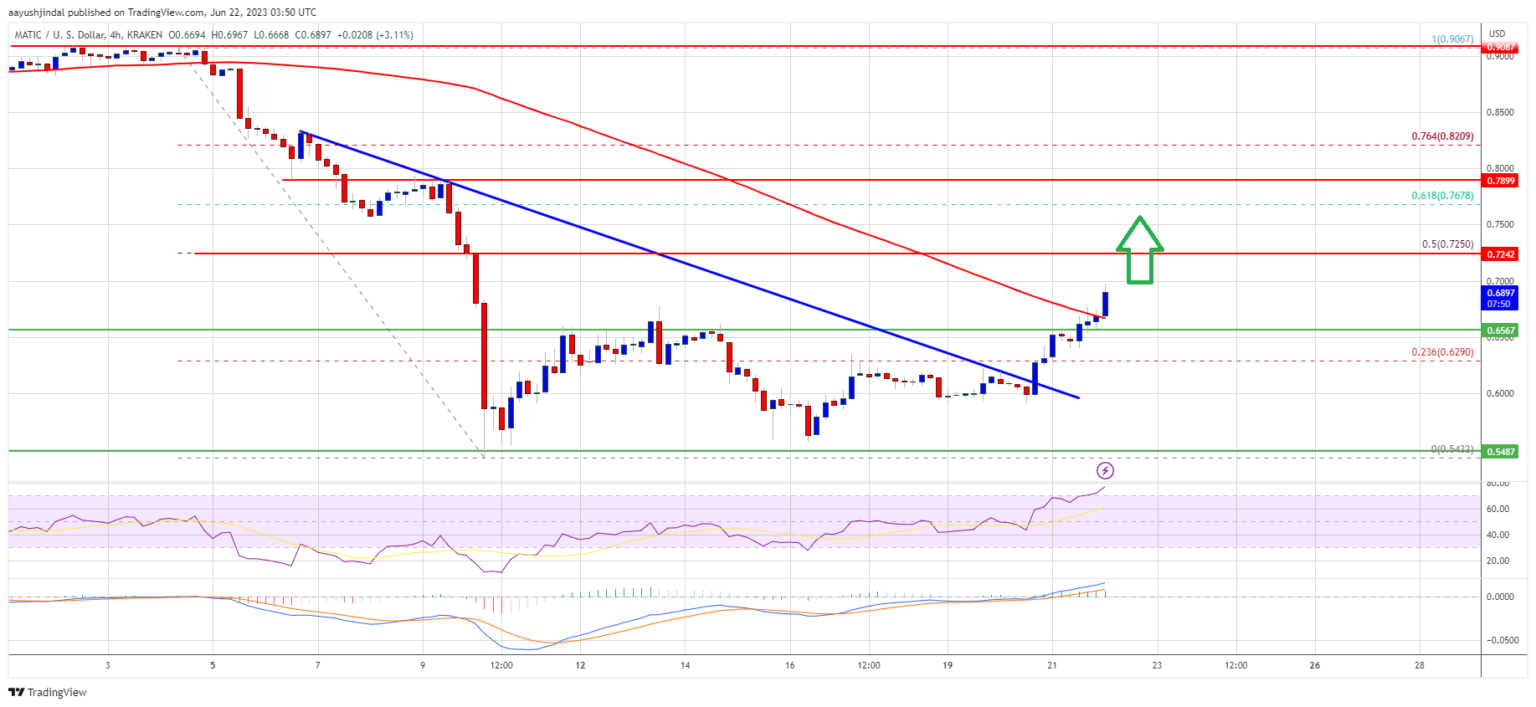 It broke the 23.6% Fib retracement level of the downward move from the $0.9067 swing high to the $0.5432 low. The MATIC price is now trading above $0.64 and the 100 simple moving average (4 hours). It is now facing resistance near the $0.725 level.