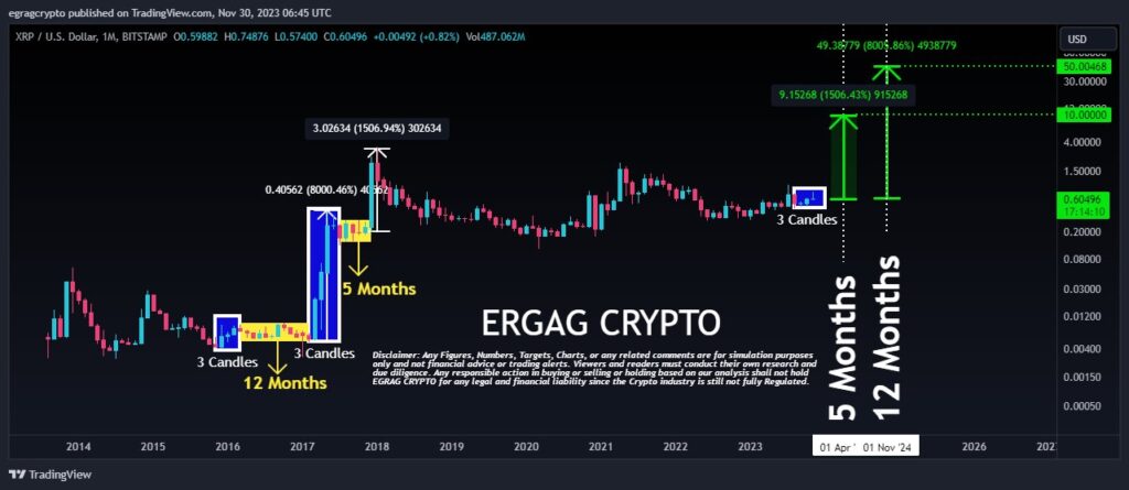 In March 2018, the XRP price embarked on an extraordinary 8,000% rally. A replication of this scenario would imply a potential increase in the price of XRP to $50 starting on November 1, 2024.