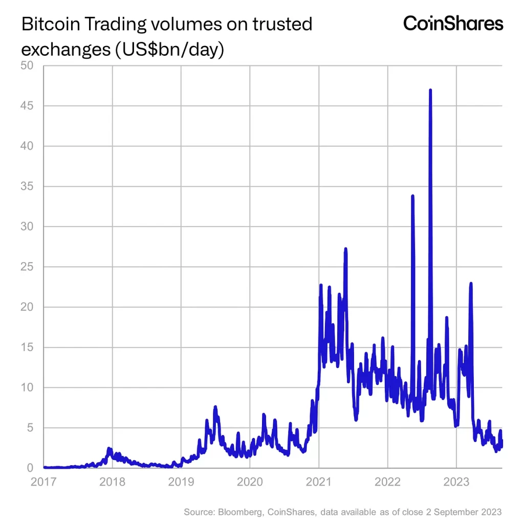James Butterfill, head of research at digital asset investment firm Coinshares, cited input from the organization’s trading team to highlight how market makers and retailers have steadily exited the exchanges in recent months. “Some are now only working five days a week on a 24-hour schedule, rather than daily,” Butterfill added.