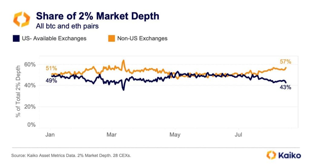 This is according to a recent report by Kaiko, Bitcoin and Ethereum liquidity in the US fell. The data showed that the share of liquidity for these assets on US exchanges fell to about 43%.