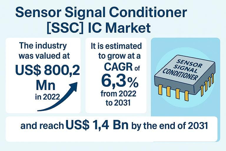 The Sensor Signal Conditioner (SSC) IC market witnesses a steady growth, fed by the increasing use of sensors in a wide range of industries for data acquisition and real-time monitoring. SSC ICs play a crucial role in improving the accuracy and reliability of sensor outputs by strengthening, filtering and conditioning the signals. These integrated circuits are integral in applications in auto systems, healthcare devices, industrial automation and consumer electronics, where precise and stable signal processing is essential.
