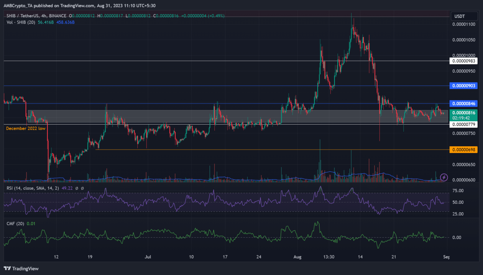 Shiba Inu [SHIB] maintained its price consolidation above the December low of $0.00000779 since the mid-August dump. This move allowed SHIB to avoid further losses after losing more than 20% in two consecutive weeks between August 14 and August 28.