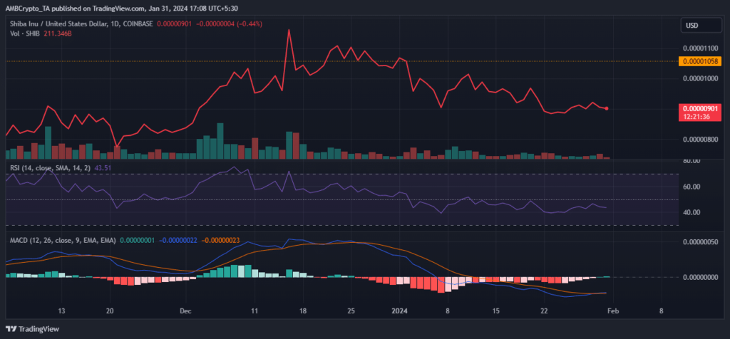 Shiba Inu [SHIB] fell 2.6% in the past 24 trading hours as the woes of the second-largest meme coin project continued in January.