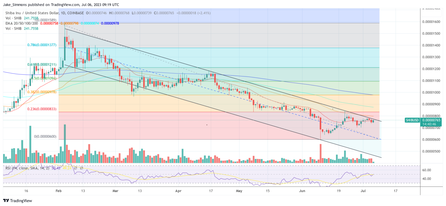 At the time of writing, SHIB was trading at $0.00000758 and is up about 3% since the publication of Kusama’s blog post. This puts SHIB price on the verge of a possible break out of the downtrend channel that has been in effect since early February. A significant rise above $0.000008 to the 38.2% Fibonacci retracement level ($0.00000831) and a subsequent breakout above this resistance is necessary to avoid a fakeout.