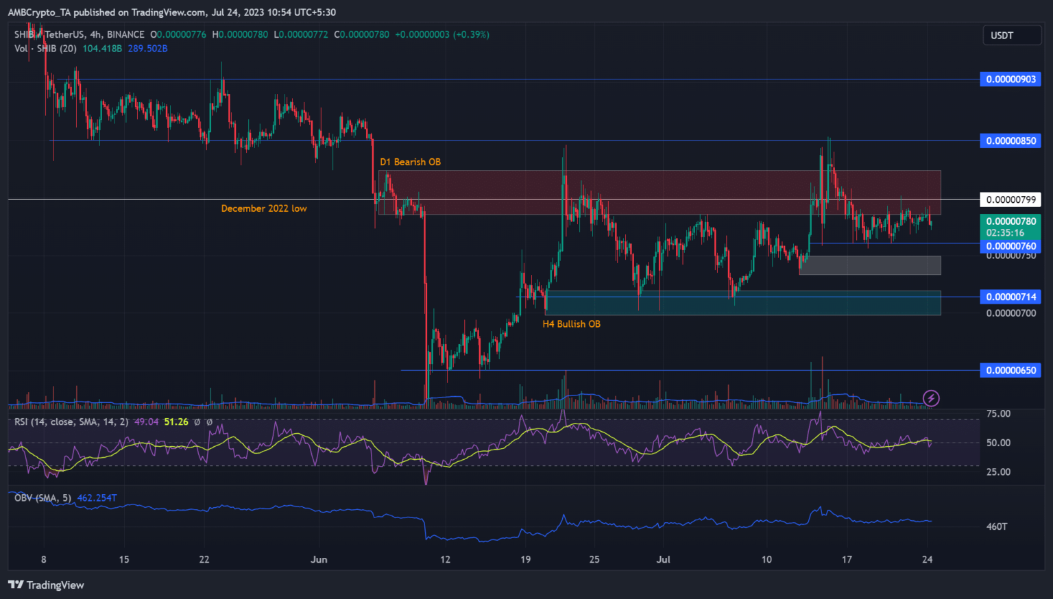 Since the second half of June Shiba Inu [SHIB] fluctuated between crucial levels of $0.00000700 – $0.00000850. A closer look at the charts revealed that the extremes of the range coincided with important order blocks worth noting, especially for macro traders focusing on volatility ahead of the Fed’s July 25/26 decision.