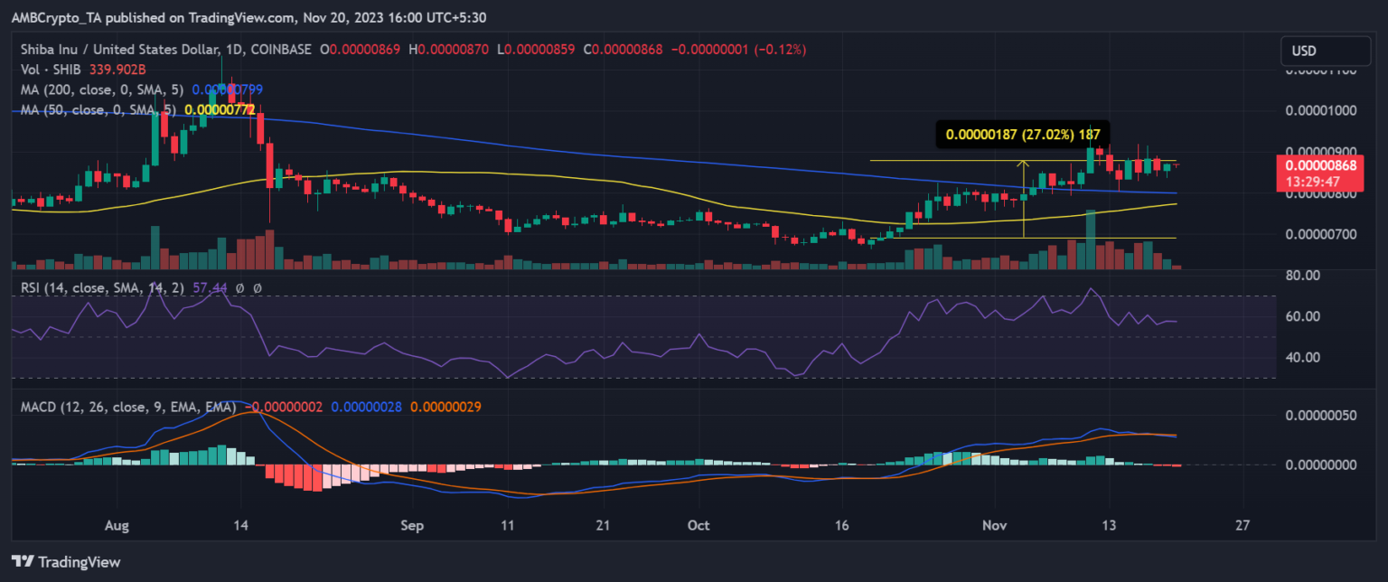 SHIB’s daily price development from October 19 to the time of writing showed a slight increase of approximately 27%. However, compared to other meme coins such as Dogecoin [DOGE]which posted a more substantial gain of over 40%, SHIB’s performance seemed mediocre.